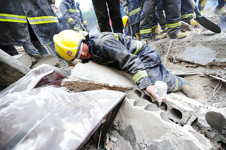 救援人员向废墟下的女子输送“生命之液”。(颜杰 摄)