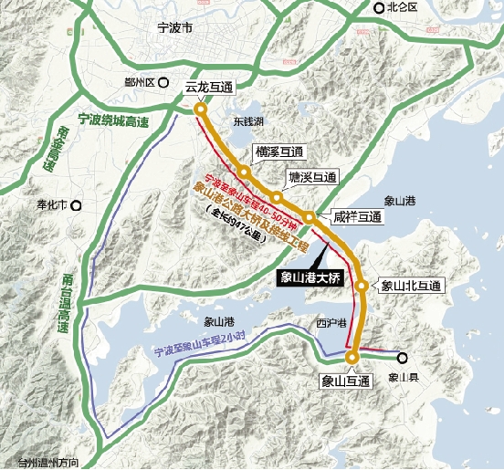:大桥的建成将使象山处于宁波半小时经济圈、杭州2小时经济圈、上海3小时经济圈中。