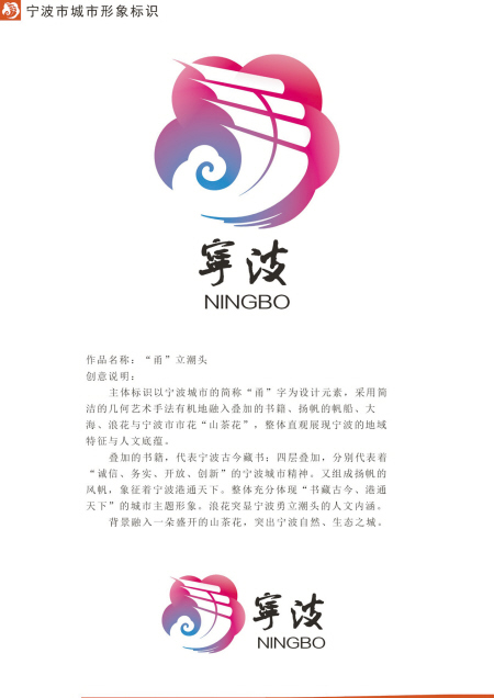 范春宏(云南) “甬”字融入叠加的书籍、帆船与“nB”,整体直观展现宁波的地域特征与人文底蕴。同时形似山茶花。