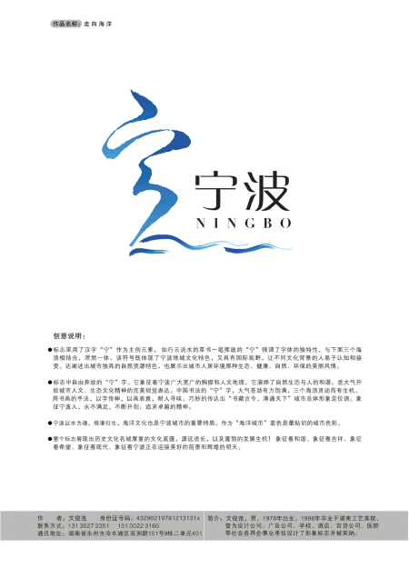 文俊违(湖南) “宁”作为主创元素,体现了宁波地域文化特色,又具有国际视野。象征着宁波宽广的胸襟和悠远的人文。