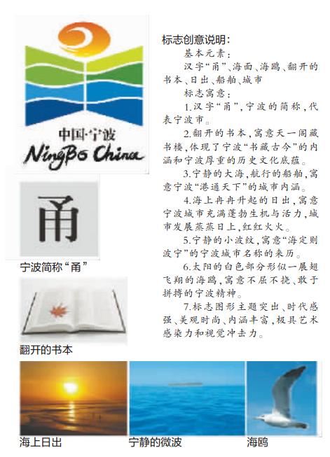 汉字“甬”、海面、海鸥、翻开的书本、日出、船舶、城市