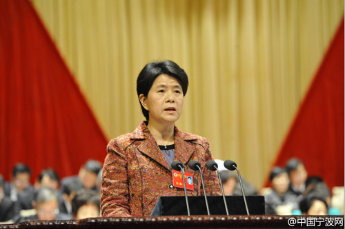 中国宁波网19日讯 据中国宁波网官方微博发布:宁波市政协十四届二次会议今日9时开幕。图为十四届市政协副主席崔秀玲作提案工作报告。