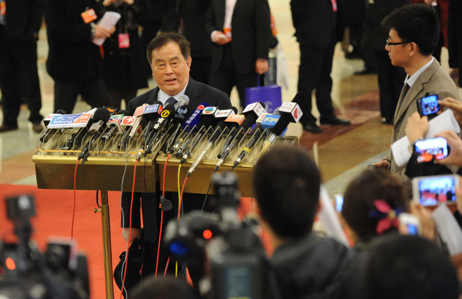 3月10日,第十二届全国人民代表大会第一次会议举行第三次全体会议,听取最高人民法院院长王胜俊作最高人民法院工作报告;听取最高人民检察院检察长曹建明作最高人民检察院工作报告;听取国务委员兼国务院秘书长马凯关于国务院机构改革和职能转变方案的说明;表决第十二届全国人民代表大会第一次会议选举和决定任命的办法草案。图为铁道部部长盛光祖接受记者群访。新华网/中国政府网 陈竞超 摄