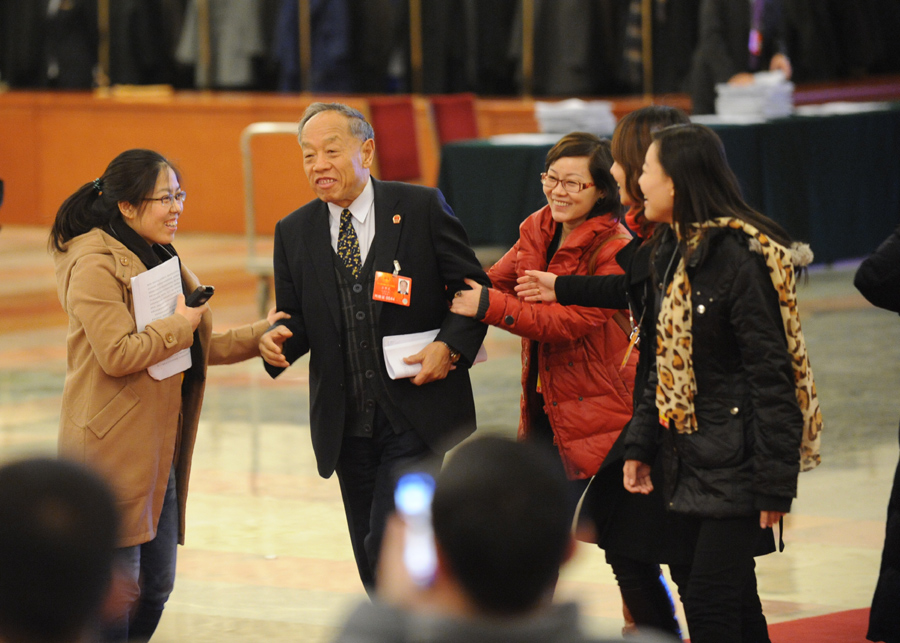 3月10日,第十二届全国人民代表大会第一次会议举行第三次全体会议,听取最高人民法院院长王胜俊作最高人民法院工作报告;听取最高人民检察院检察长曹建明作最高人民检察院工作报告;听取国务委员兼国务院秘书长马凯关于国务院机构改革和职能转变方案的说明;表决第十二届全国人民代表大会第一次会议选举和决定任命的办法草案。原外交部长李肇星步履匆匆,但还是被“眼疾手快”的记者们团团围住。新华网/中国政府网 陈竞超 摄