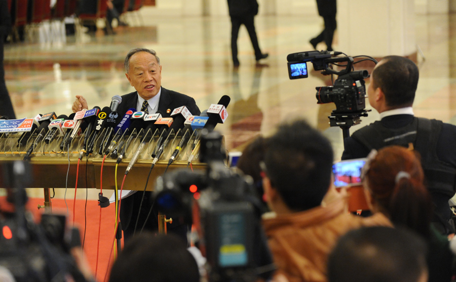 3月10日,第十二届全国人民代表大会第一次会议举行第三次全体会议,听取最高人民法院院长王胜俊作最高人民法院工作报告;听取最高人民检察院检察长曹建明作最高人民检察院工作报告;听取国务委员兼国务院秘书长马凯关于国务院机构改革和职能转变方案的说明;表决第十二届全国人民代表大会第一次会议选举和决定任命的办法草案。图为原外交部长李肇星接受记者群访。新华网/中国政府网 陈竞超 摄