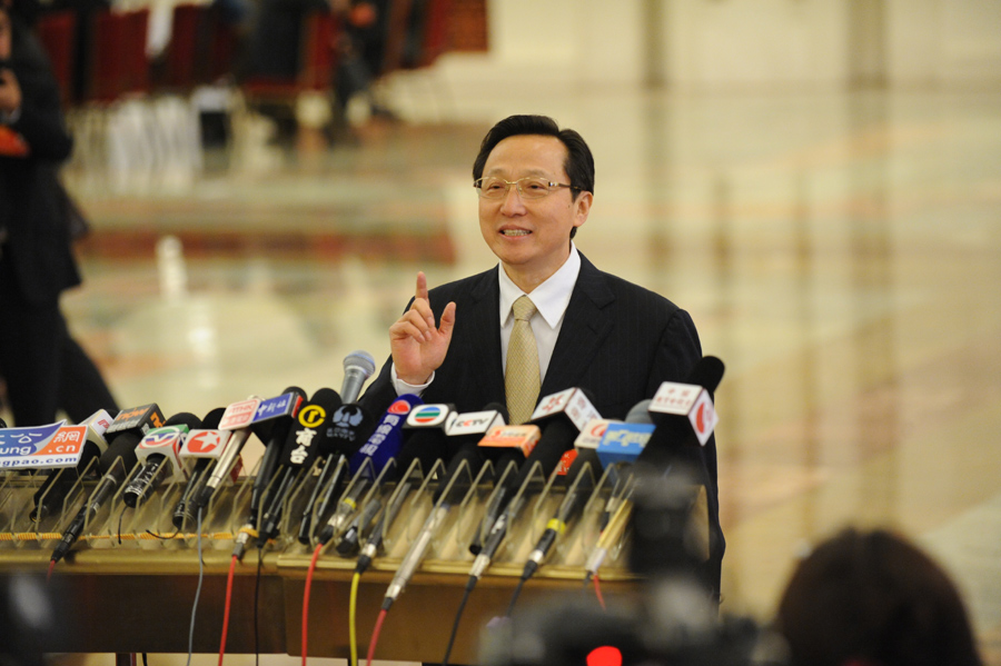 3月10日,第十二届全国人民代表大会第一次会议举行第三次全体会议,听取最高人民法院院长王胜俊作最高人民法院工作报告;听取最高人民检察院检察长曹建明作最高人民检察院工作报告;听取国务委员兼国务院秘书长马凯关于国务院机构改革和职能转变方案的说明;表决第十二届全国人民代表大会第一次会议选举和决定任命的办法草案。图为农业部部长韩长赋接受记者的群访。新华网/中国政府网 陈竞超 摄