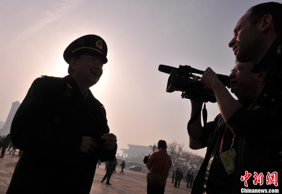 3月8日上午,全国政协十二届一次会议在北京人民大会堂举行第三次全体会议,外国记者采访解放军委员。中新社发 贾国荣 摄
