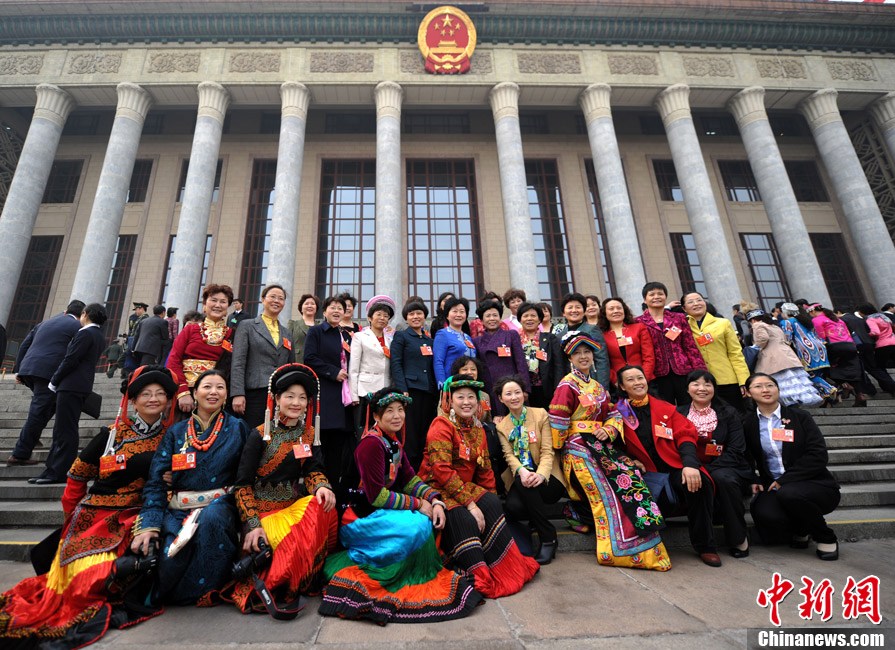 3月8日,十二届全国人大一次会议举行第二次全体会,四川少数民族代表在大会堂前合影。中新网记者 金硕 摄