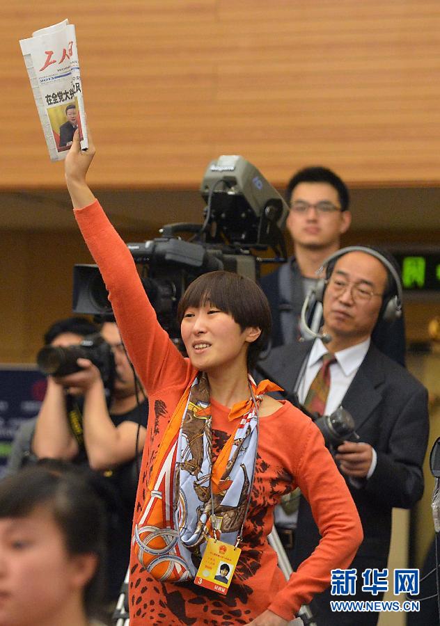 3月13日,十二届全国人大一次会议在两会新闻中心举行记者会,中国人民银行行长周小川等就“货币政策与金融改革”有关问题回答记者提问。由于提问者太多,一位《工人日报》的女记者情急之下,举起一份工人日报,站在凳子上高声大喊:“请给工人阶级一个提问的机会!”引起了现场一片笑声。新华社记者王颂摄