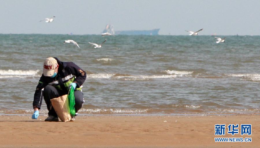 【河北秦皇岛】4月7日,河北秦皇岛野生动物救护中心的禽流感疫情监测人员在北戴河鸽子窝海滩采集野生鸟类粪便。近日,由于我国南方爆发H7N9禽流感疫情,秦皇岛野生动物救护中心的鸟类专家加紧了对候鸟的监测密度,在秦皇岛沿海近200公里海岸线的7个监测点采集数百个野生鸟类粪便样本,送往相关部门检测。新华社发(刘光昱 摄)