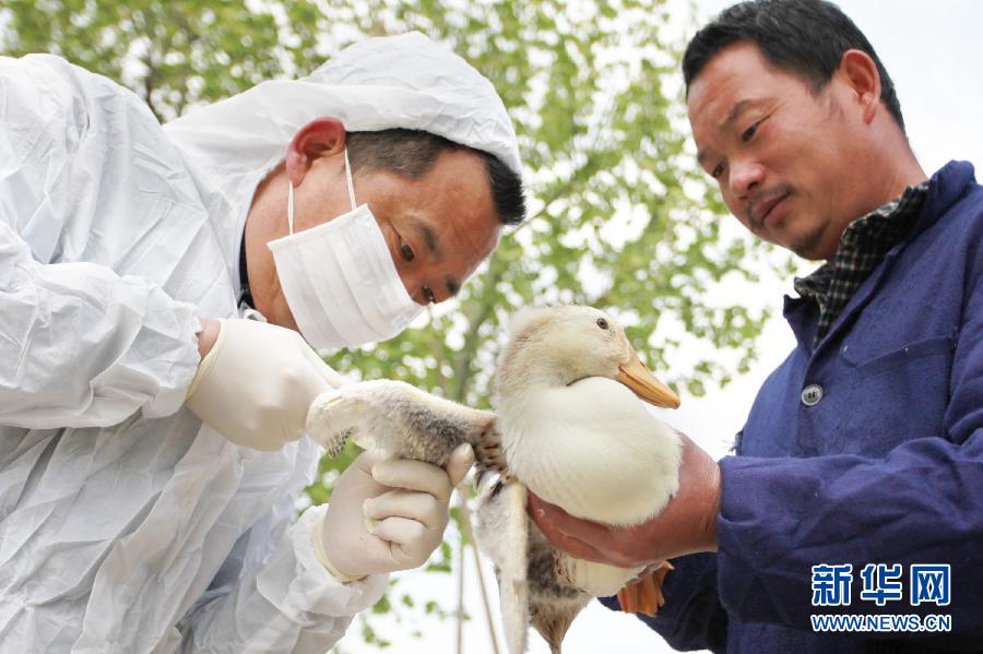 【浙江省缙云】 多地采取多种措施严防H7N9禽流感 4月8日,浙江省缙云县畜牧局工作人员(左)在养鸭场检查。当日,缙云县畜牧局对全县畜禽规模养殖场、交易市场和屠宰场进行防疫检疫监管和无害化处理告知承诺,并实行24小时值班制度,严密防控H7N9禽流感。新华社发(许小峰 摄)
