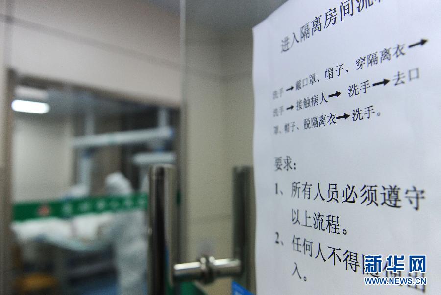 4月8日,亳州市人民医院重症监护室门上张贴者“进入隔离房间流程”。当日,记者走进安徽省亳州市人民医院重症监护室,用镜头记录了1例人感染H7N9禽流感确诊病例的治疗过程。患者李某,男,55岁,亳州市谯城区人,从事活禽销售与宰杀工作。3月28日患者发病,4月1日因病情加重至亳州市人民医院治疗。4月6日,安徽省疾控中心实验室检测结果为H7N9禽流感病毒核酸阳性,4月7日,中国疾控中心实验室复核结果为H7N9禽流感病毒核酸阳性。目前,患者病情稳定。新华社记者 刘军喜 摄