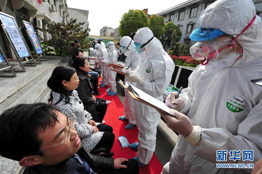 4月9日,合肥市长丰县疾病预防控制中心举行人感染H7N9禽流感防控应急演练。这是医务人员在演练中核实“患者”个人信息。根据安徽省人感染H7N9禽流感疫情发展情况,安徽省政府日前启动流感流行应急预案Ⅳ级响应。安徽各地积极部署并采取有效措施,加大疫情防控力度。新华社发