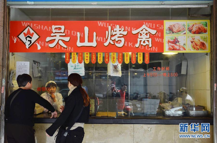 4月10日,浙江省杭州市一家烤禽店的员工向顾客介绍店内食品。 杭州确诊人感染H7N9禽流感病例以来,该市各大饭店、酒家纷纷取消了禽类熟食制品供应,一些著名禽类熟食制品店的销售量大幅跳水。 新华社发(龙巍 摄)