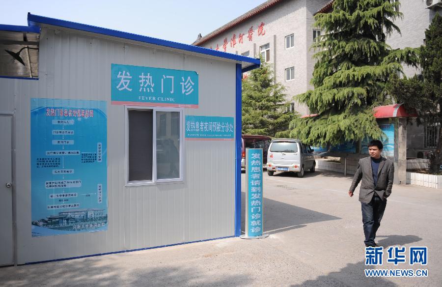 4月14日,河南省开封市河南大学淮河医院专门设立发热门诊。 当日,河南省卫生厅通报,开封市、周口市各确诊1例人感染H7N9禽流感病例。 4月11日晚,河南省疾控中心对两例病例标本检测显示H7N9禽流感病毒核酸阳性,4月14日6时,经中国疾控中心复核,确定为H7N9禽流感病毒核酸阳性。依据患者的临床表现、实验室检测和流行病学调查结果,省级专家组综合判定为人感染H7N9禽流感确诊病例。经调查,两例病例的密切接触者共19人,已及时采取医学观察措施,目前所有密切接触者均未发现异常。 新华社记者 李博 摄