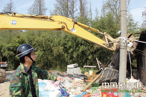 推土机轰鸣,执法队员一线现场指挥,存在重大安全隐患的垃圾站、旧厂房等违章建筑一一被清理。4月12日,丹西街道、县国土、城管、规划、供电供水等有关部门进行联合执法,对丹西街道山头董村一家违建废品回收加工厂(见图)进行拆除,打响了我县“三改一拆”专项整治行动的第一炮。