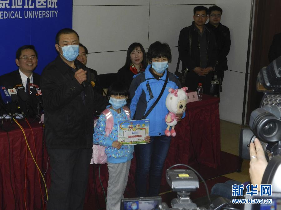 4月17日,在北京地坛医院,北京首例H7N9禽流感患儿姚某在父母陪同下在新闻发布会上与大家告别。