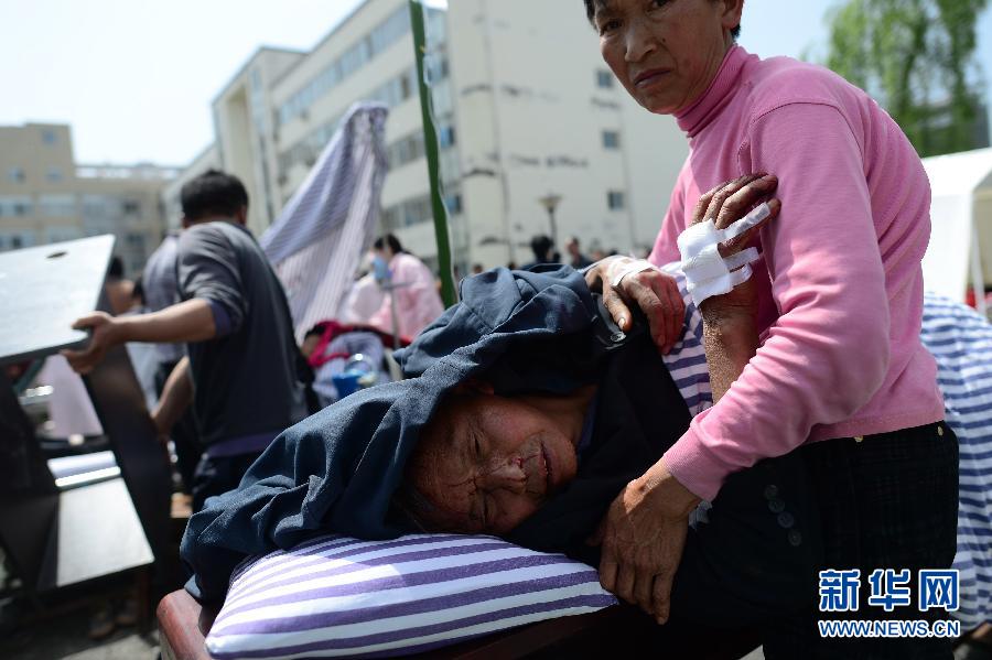 4月20日,伤者在芦山县人民医院接受治疗。从四川省地震局获悉,截至4月20日11时5分左右,雅安地震已造成四川省14人死亡,其中新津1人,天全3人,芦山4人,洪雅1人,泸定1人,宝兴3人,德阳1人。据中国地震台网测定,当日8时2分,四川省雅安市芦山县发生7.0级地震,震源深度约13公里。 新华社记者 江宏景摄