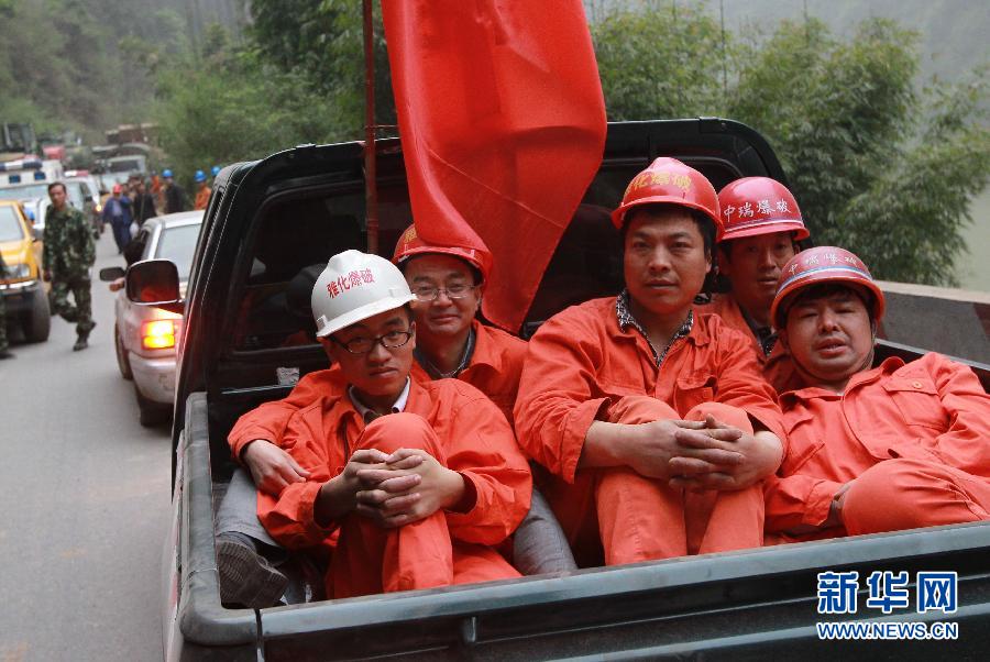 4月21日,几名专业爆破人员完成任务后从灵关镇附近彻底。经清障人员连续十几个小时的昼夜奋战,截至4月21日17时,芦山县城通往宝兴县灵关镇的道路已基本抢通,车辆可以通行,灵关镇大部分受伤群众已经转运出县接受更好的救治,更多的救援、医疗、电力、后勤保障等队伍正陆续进入。新华社记者 裴鑫 摄