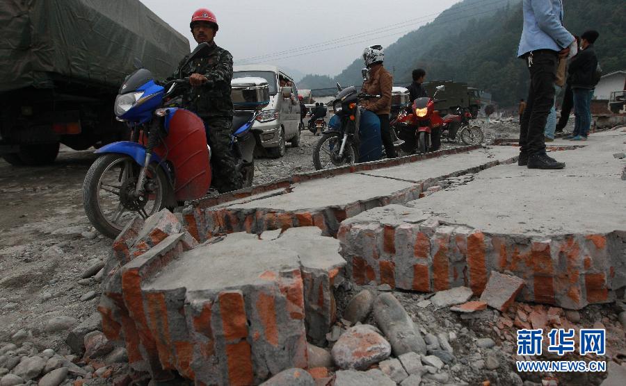 4月21日,几名骑摩托车的当地居民等待通过即将打通的道路。经清障人员连续十几个小时的昼夜奋战,截至4月21日17时,芦山县城通往宝兴县灵关镇的道路已基本抢通,车辆可以通行,灵关镇大部分受伤群众已经转运出县接受更好的救治,更多的救援、医疗、电力、后勤保障等队伍正陆续进入。新华社记者 裴鑫 摄
