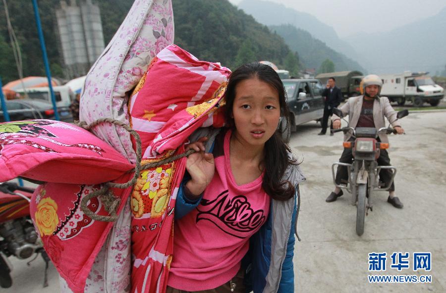 4月21日,家住灵关镇的王佩霞正步行前往受灾群众安置点。经清障人员连续十几个小时的昼夜奋战,截至4月21日17时,芦山县城通往宝兴县灵关镇的道路已基本抢通,车辆可以通行,灵关镇大部分受伤群众已经转运出县接受更好的救治,更多的救援、医疗、电力、后勤保障等队伍正陆续进入。新华社记者 裴鑫 摄