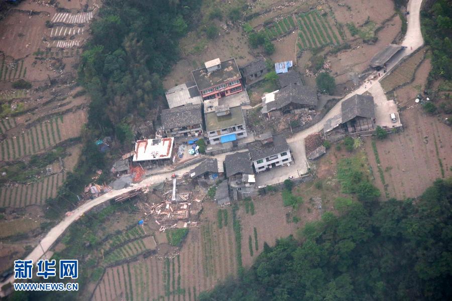 这是4月21日从宝兴县空中拍摄的灾区照片。 4月21日,成都军区某陆航旅直升飞机运送40名国家地震灾害紧急救援队队员进入宝兴县。记者随机搭乘,从空中拍摄了芦山县、宝兴县等受灾地区的照片。新华社记者 李刚 摄