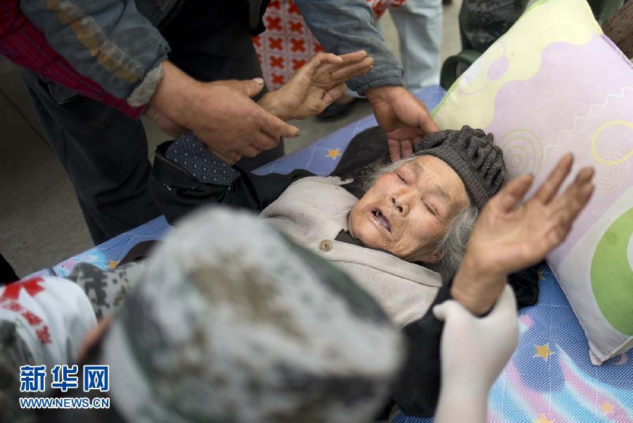 4月21日,在太平镇临时医疗点,成都军区总医院的医生在对85岁的枝桂英老人进行诊治,初步诊断,老人可能是腰部骨折。 “4·20”芦山地震发生后,芦山县太平镇受灾严重。目前,在太平镇已经建起临时医疗点救治伤员。同时救援队伍已经将搜救范围由村镇的主要街道扩展到偏僻山村。新华社记者 费茂华 摄