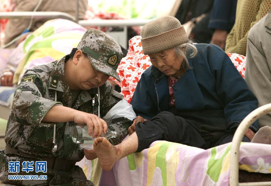 4月21日,在太平镇临时医疗点,成都军区总医院医生在为85岁的李雪梅老人诊治其受伤的脚部。 “4·20”芦山地震发生后,芦山县太平镇受灾严重。目前,在太平镇已经建起临时医疗点救治伤员。同时救援队伍已经将搜救范围由村镇的主要街道扩展到偏僻山村。新华社记者 费茂华 摄