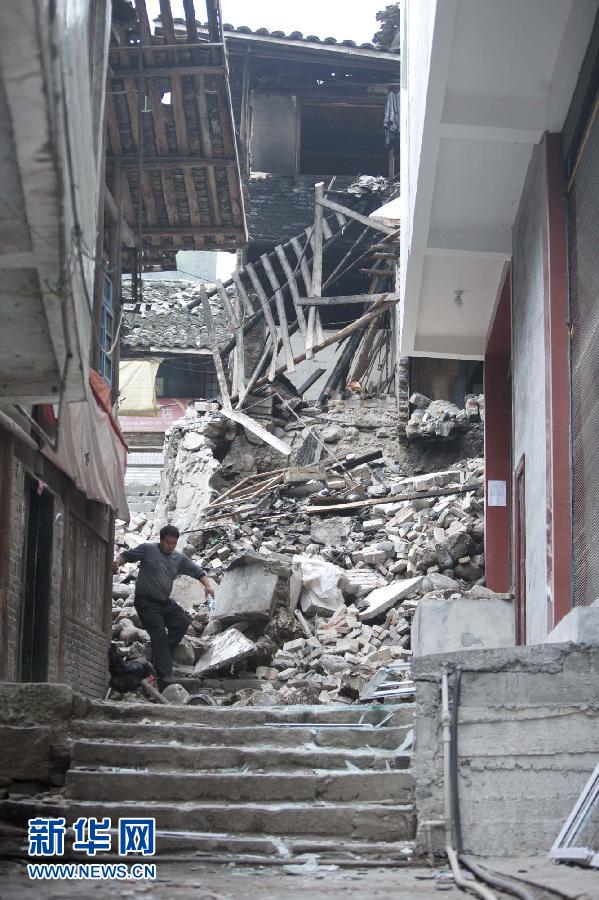 这是4月21日拍摄的太平镇的受灾情况。 “4·20”芦山地震发生后,芦山县太平镇受灾严重。目前,在太平镇已经建起临时医疗点救治伤员。同时救援队伍已经将搜救范围由村镇的主要街道扩展到偏僻山村。新华社记者 费茂华 摄
