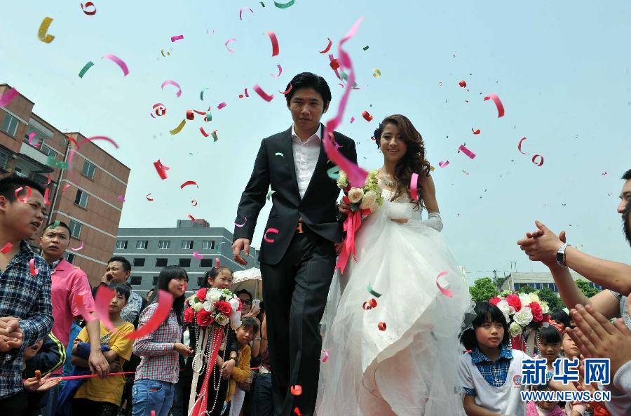4月21日,尽管余震不断,荥经县城一对新人如期举行了婚礼。 “4·20”芦山地震给当地居民的生活造成很大破坏,但灾区群众在各方的帮助下,迅速投入到自救和生产生活之中。在条件简陋的临时居所里,生活依然在继续。新华社记者 杨楹 摄