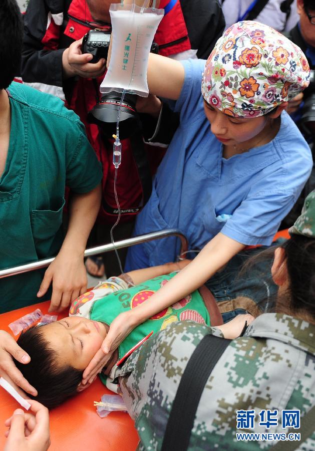 4月21日,医务人员在芦山县人民医院安抚一名5岁的小伤员。据四川省民政厅21日17时统计,四川芦山7级地震已造成208人死亡、失踪,其中184人死亡、24人失踪,另有11826人受伤。地震给灾区群众带来伤病与离别,来自全国各地的医务人员第一时间来到他们身边,挽救伤者的生命,减少他们的痛苦。为了每一个鲜活的生命,所有参与救援的人们竭尽全力。新华社发(李华梁摄)