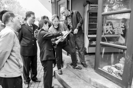 执法人员在新典路一家快餐店检查。记者徐佳伟摄