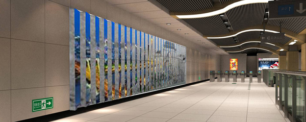 设计很多棱形装置,在右侧面放置分块的唐、宋三江口的海运码头绘画,在左侧面放置分块的现代三江口繁华景象图片。使欣赏者由艺术品左侧经过和由右侧经过产生截然不同的视觉效果。将东门口地区古代与现代的对比图像呈现在观众眼前,直观的揭示当代宁波的飞速发展。