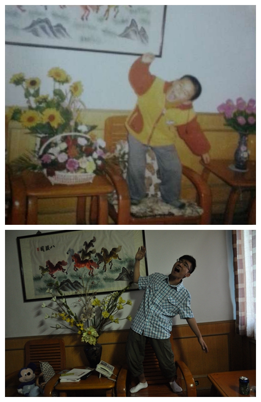马惠炜小时候爱闹爱玩,调皮捣蛋,拍照时总是摆些稀奇古怪的姿势。但是随着年龄的增长,我们拍摄小组要求他摆出和照片上一样的动作时,他却怎么也摆不出来了,表情尴尬,最后还是勉强地摆出了个差不多的姿势。随着时光流逝,是否我们的童趣也渐渐消失了呢?