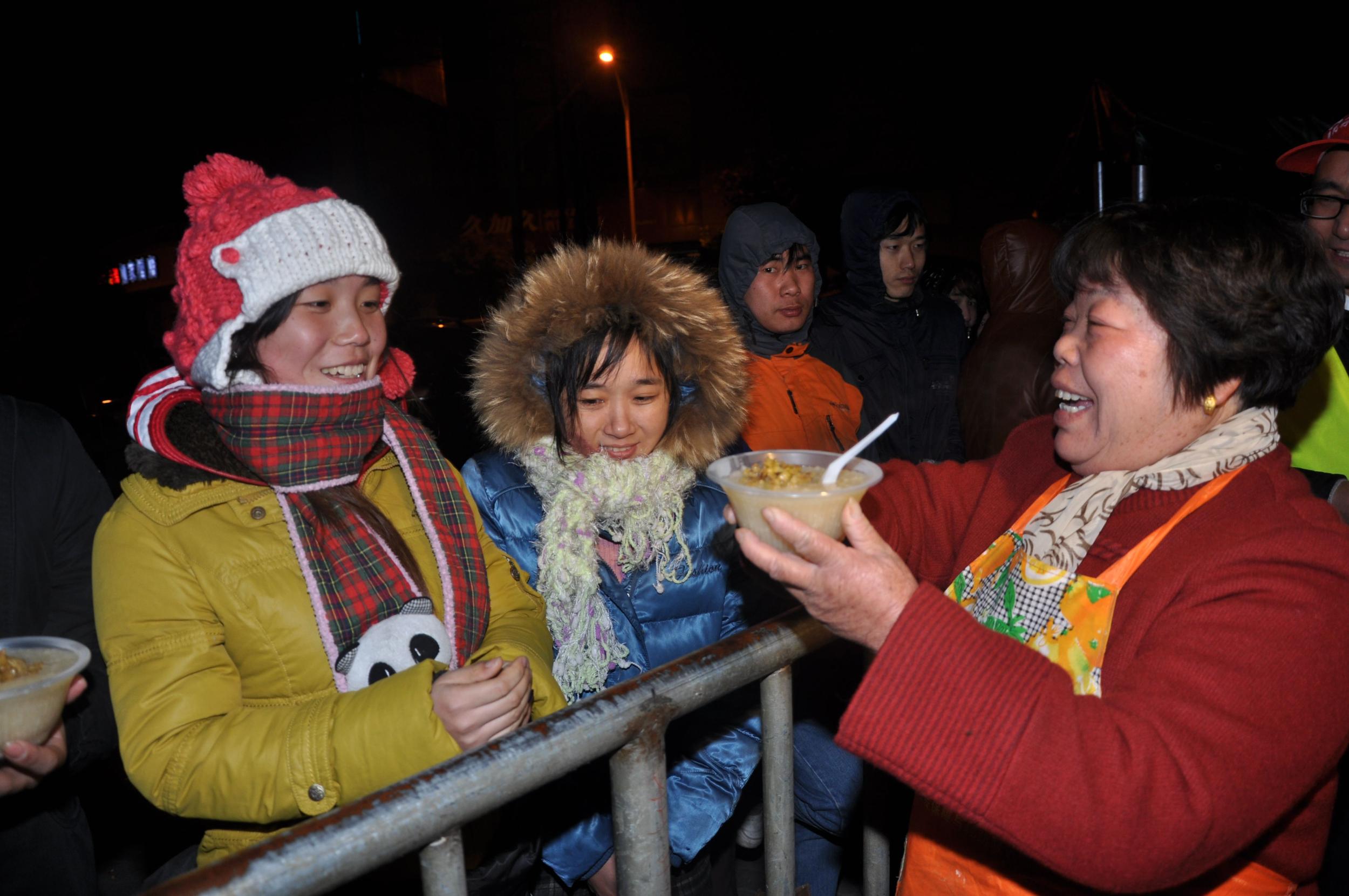 已经连续三年的春运期间,一个仅有1米5左右个子的65岁老太太,骑着一辆略显破旧的蓝色电动车,挨个儿为彻夜排队购买春节车票的人们送去一碗碗白粥、一杯杯姜汤。从队首到队尾,她走走停停,取杯、盛粥、加榨菜或拌辣油、递粥,看似普通的4个动作在重复上百次,几千次后,成为那段寒日里购票人心中最温暖的一道风景线。她的事迹被中央、省、市等各级新闻媒体争相报道,网络上掀起了“送粥奶奶”热。这就是玉兰社区热心的居民——陈杏娣阿姨。