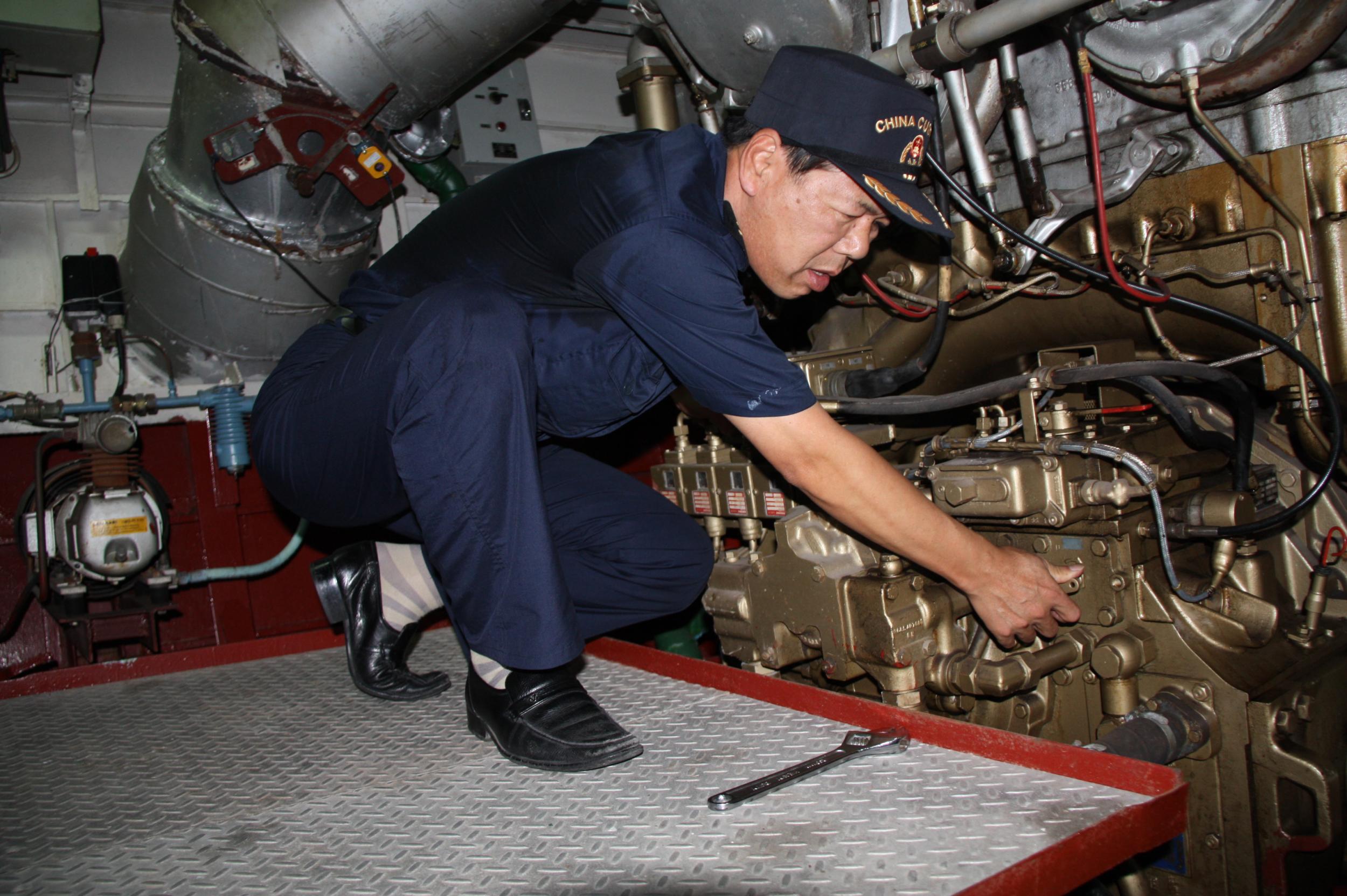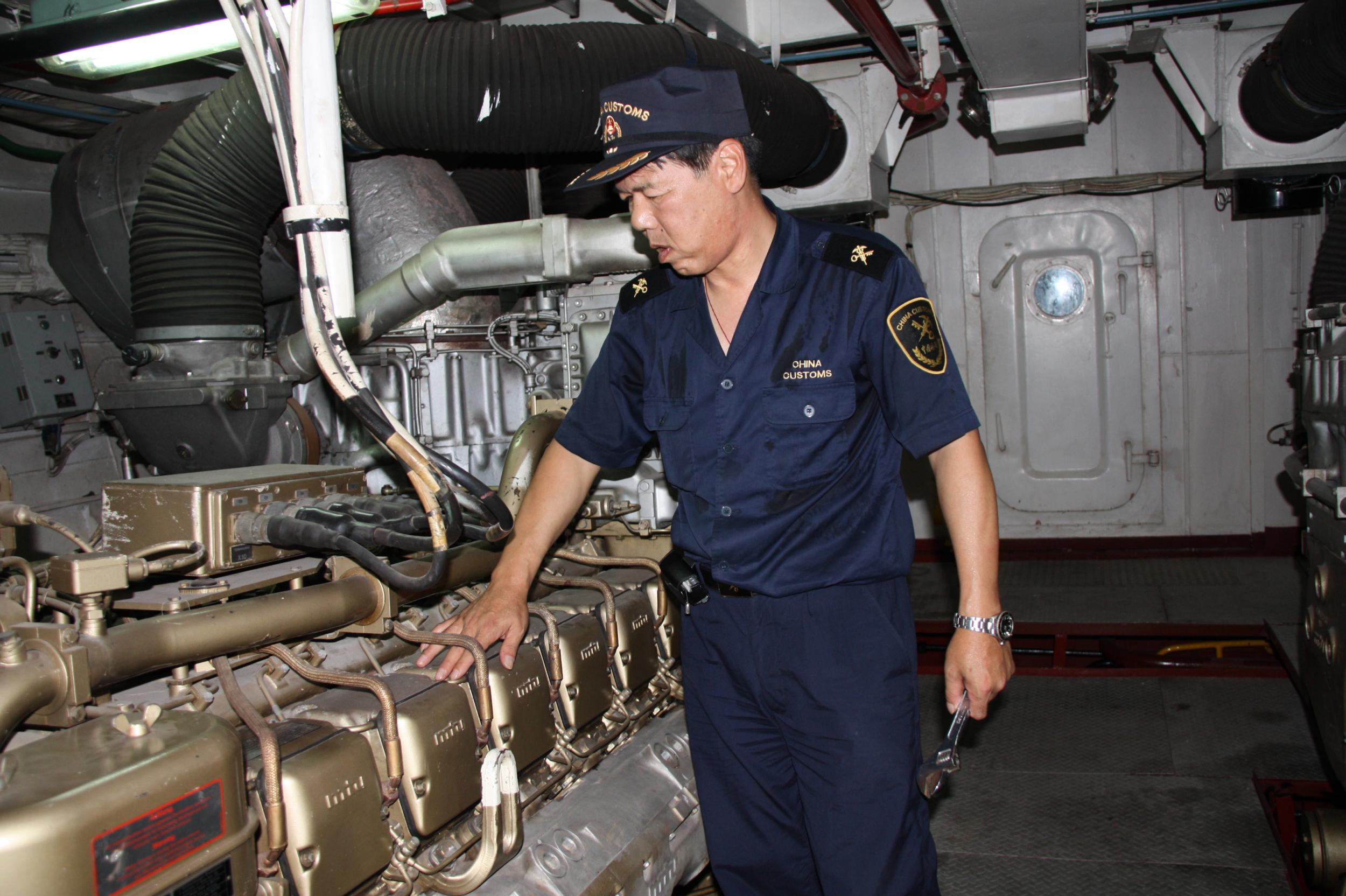 三十四年来,海关缉私艇换了一艘又一艘,人员换了一茬又一茬,身边不少同事已经离开了缉私艇,有些还在仕途上有了一番作为,但卢元铭却一直坚守在缉私艇岗位,在轮机工作岗位上默默无闻、任劳任怨,从没有向领导提出过分的要求,也从未有过离开海缉部门换个舒适岗位的念头。老卢一步步从轮机员成长为三管轮、二管轮、大管轮,如今已是“海关828”、“海关601”、“海关1266”三艘缉私艇的轮机长。按规定轮机长可以不当班,可他总是闲不住,总是守在机舱。凭借着对舰艇工作的热爱,他乐此不疲不知岁月流转,辛苦劳累依旧甘之如饴,用他的话讲:“一听到机器声,我就不知不觉走进去了”。