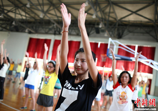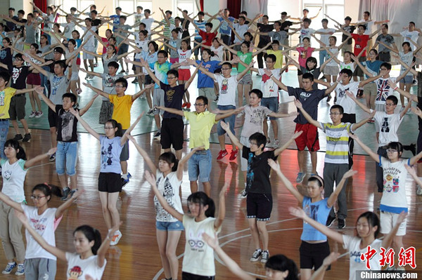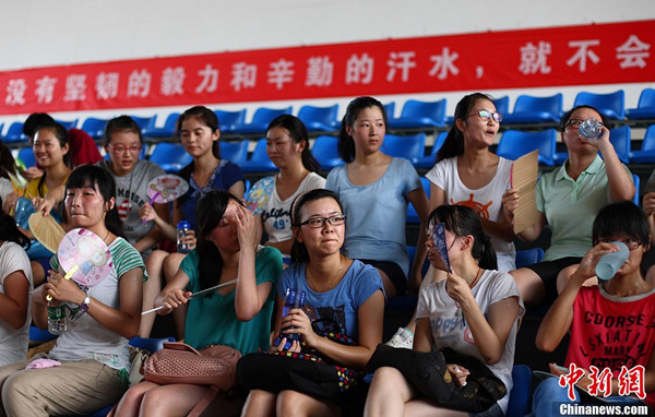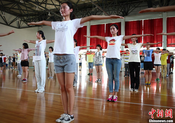 7月18日,参加2013亚洲青年运动会开幕式演出的志愿者冒着酷暑在排练节目的间隙休息片刻。随着亚青会的即将开幕,来自南京26所高校、服务于亚青会各个角落的一万三千多名志愿者全面上岗,将进行一个月的培训和专业训练。