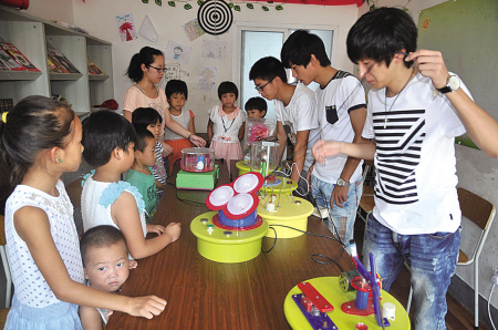 奉化“春泥社”负责人介绍,拾荒者公寓的孩子,家境较为贫寒,平时难得出门,科普知识接触也少。当天,“春泥社”志愿者带去了迷你电报机、红外线观测仪、静电感应器、趣味手印、无线电能等多种科普仪器,让孩子们零距离感受科技的魅力。