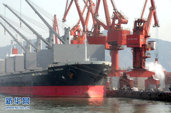 一艘大型远洋运输轮在江苏连云港港东联公司码头卸载进口氧化铝(2013年3月3日摄)。十八大以来,我国努力适应经济全球化的新形势,不断探索对外开放新路子,建立中国(上海)自由贸易试验区,进一步改善外贸发展的制度和政策环境……一系列重要举措将扩大开放与体制改革相结合,为下一步中国经济发展注入了新的强劲动力。新华社发(王春摄)