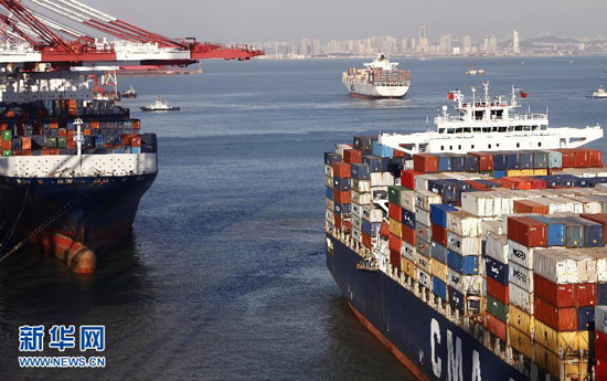 这是繁忙的青岛港集装箱码头一角(2013年11月7日摄)。青岛港口吞吐量已居世界港口第七位。十八大以来,我国努力适应经济全球化的新形势,不断探索对外开放新路子,建立中国(上海)自由贸易试验区,进一步改善外贸发展的制度和政策环境……一系列重要举措将扩大开放与体制改革相结合,为下一步中国经济发展注入了新的强劲动力。新华社记者李紫恒摄