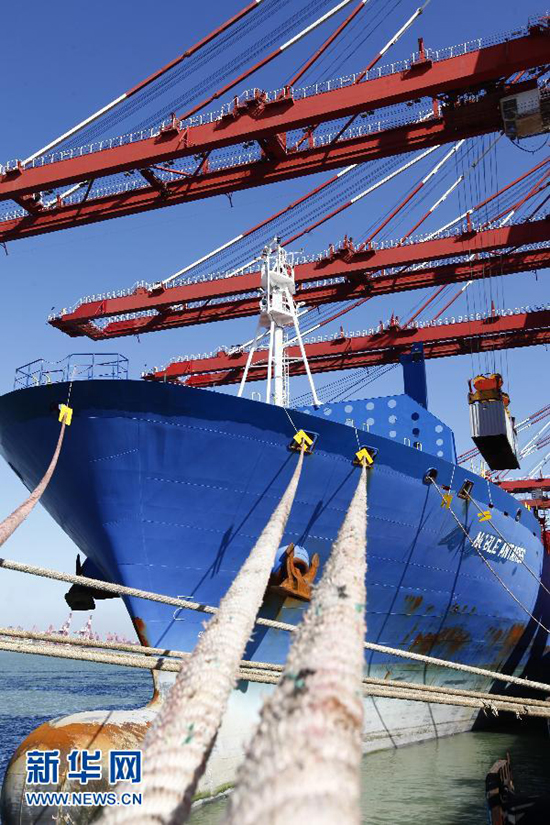 这是繁忙的青岛港集装箱码头一角(2013年11月7日摄)。青岛港口吞吐量已居世界港口第七位。十八大以来,我国努力适应经济全球化的新形势,不断探索对外开放新路子,建立中国(上海)自由贸易试验区,进一步改善外贸发展的制度和政策环境……一系列重要举措将扩大开放与体制改革相结合,为下一步中国经济发展注入了新的强劲动力。新华社记者李紫恒摄