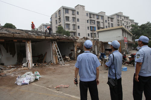 海曙区在强势推进整治的同时,以人为本,服务为民,实现了“三改一拆”的和谐推进。在小沙泥街破墙开门封闭工作进入最后冲刺阶段时,店铺封墙后需要预留门框和窗框的位置,由于统一门窗制作及安装均需一周时间,这一周内住户的门窗将毫无庇护,一些住户对此忧心忡忡。为使里面的财物不至丢失,城管队员们主动承担起安保任务,每天4名队员自21时至次日8时轮流值班、彻夜保障。看见城管队员半夜耐着高温酷暑、忍着蚊虫叮咬为自家店铺看守时,原本不接受整改的纪师傅不禁心悦诚服并主动配合整治。