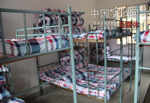 图为加泰罗尼亚集团赠送的床上用品整洁的铺在住宿生的床上