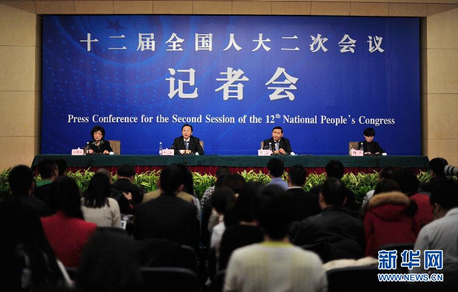 3月6日,十二届全国人大二次会议新闻中心举行记者会,邀请农业部部长韩长赋等就“扎实深化农村改革,加快发展现代农业”的相关问题,回答中外记者的提问。新华社记者 肖艺九 摄