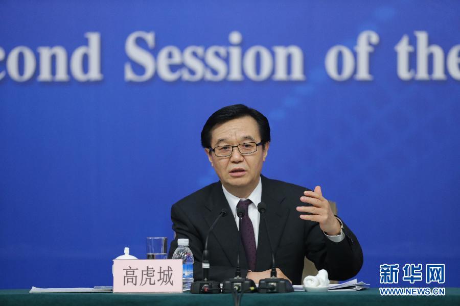 3月7日上午,十二届全国人大二次会议新闻中心举行记者会,邀请商务部部长高虎城就“商务发展与对外开放”的相关问题回答中外记者的提问。新华社记者 邢广利 摄