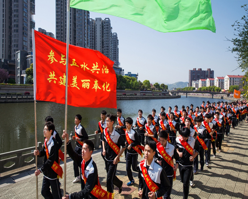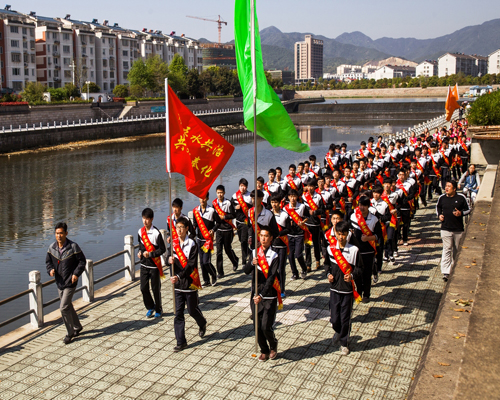 奉化一所职业学校的学生为宣传五水共治举行的环县江跑步活动,一边还高喊宣传口号,让百姓们知道五水共治的必要性。
