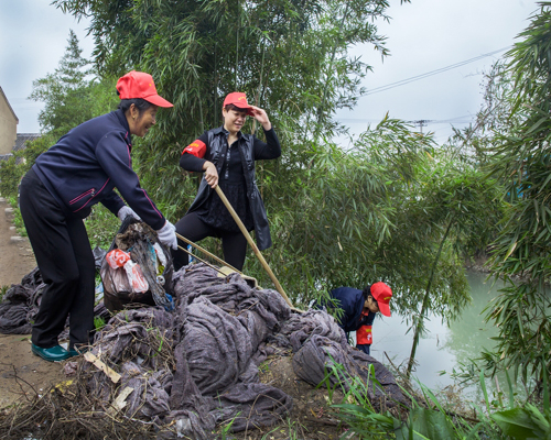奉化锦屏街道妇女志愿者在清理河道,她们有的年龄已过60岁了。