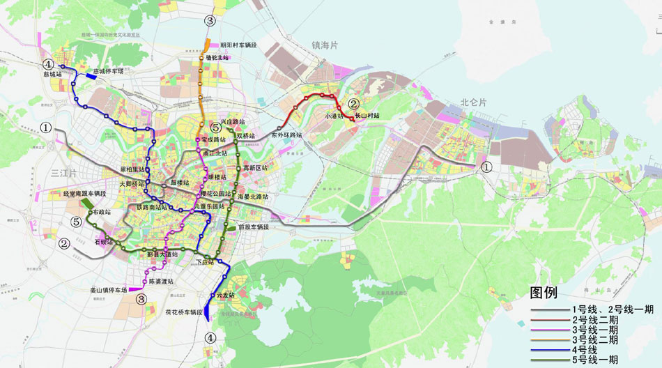 5号一期工程线路起自鄞州布政站,沿规划阳光路~云林中路~鄞县大道~过奉化江~鄞县大道~金达路~海晏路~院士路~过甬江~院士路~清泉路至兴庄路站。 |
