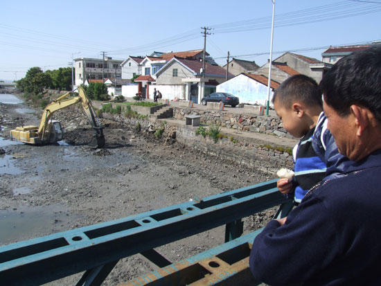 老少百姓关注新农村河道整治工程进展情况,期盼早日完工,美化生态环境,造福当地人民。