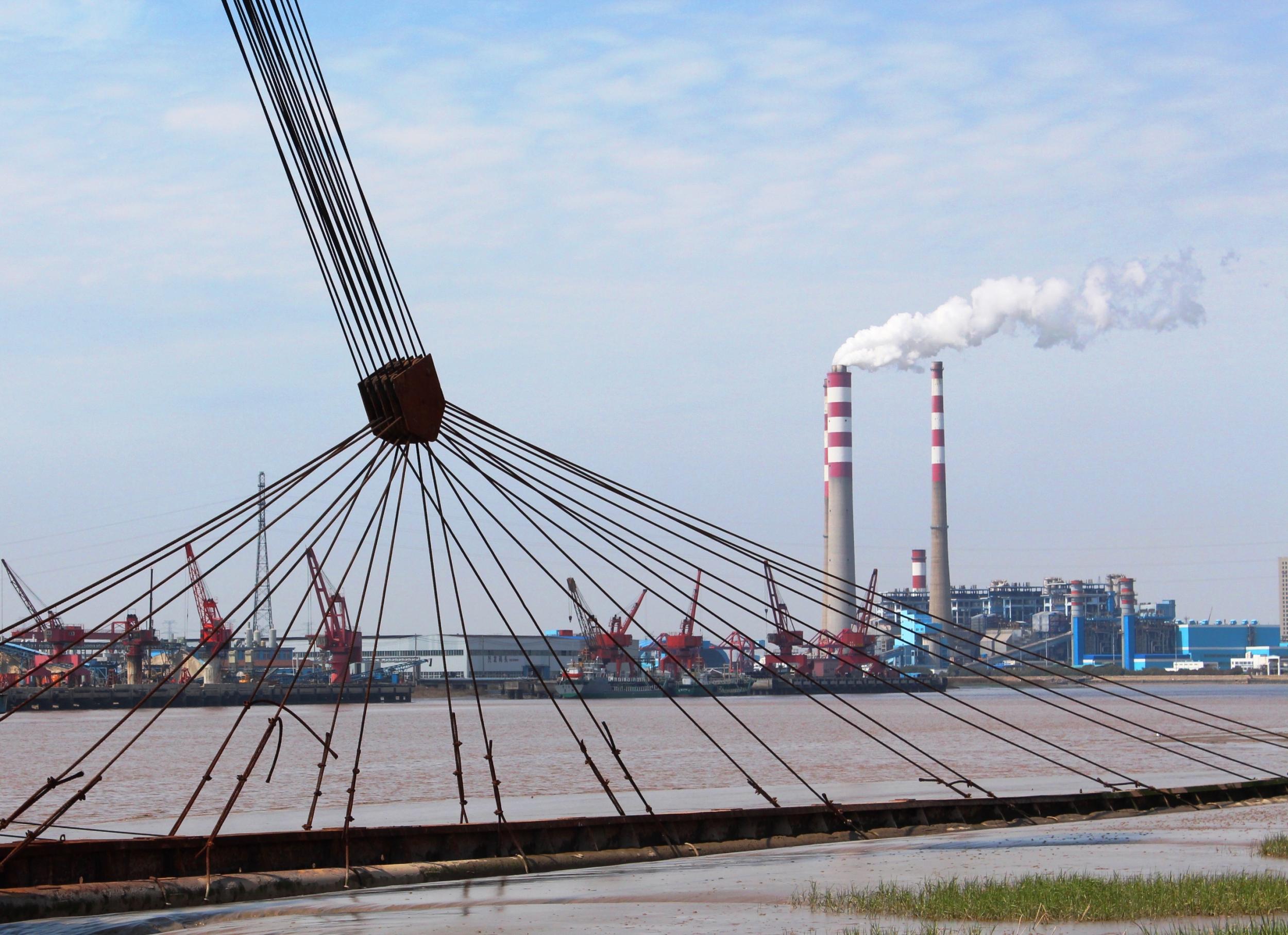 远处是镇海电厂的烟囱,经过脱硫脱硝处理后冒着白烟,很快在蓝天中消散;近景是拉索桥吊,象一个倒写的“不”字,寓意镇海区在发展重工业的同时,坚决向污染说不,积极营造蓝天碧水。2014年3月23日摄于镇海甬江入海口。